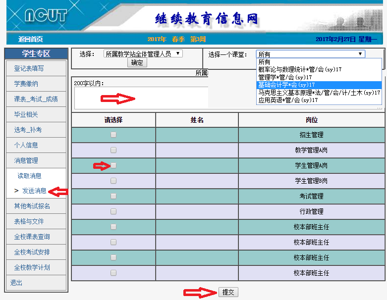 点击【消息管理】à【发送消息】可向教学站管理人员、课堂任课教师发送文本消息。